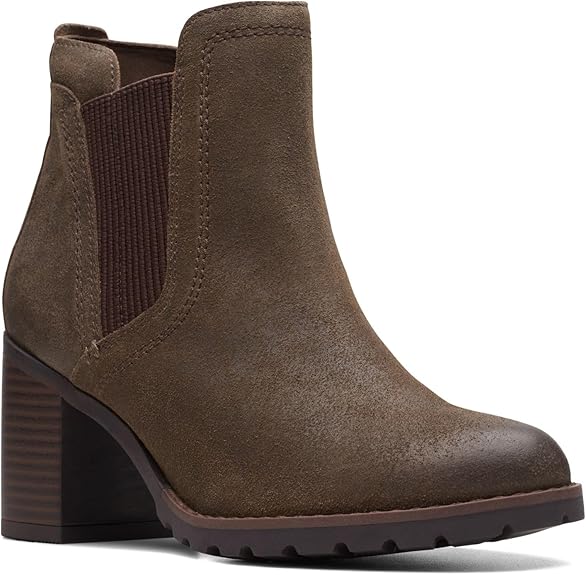 Elevate your favorite look with this suede bootie that will give the all-day comfort of a molded, cushioned footbed. It has a block stacked heel and a versatile silhouette. There are side stretch panels and a rear pull-tab for easy wear.