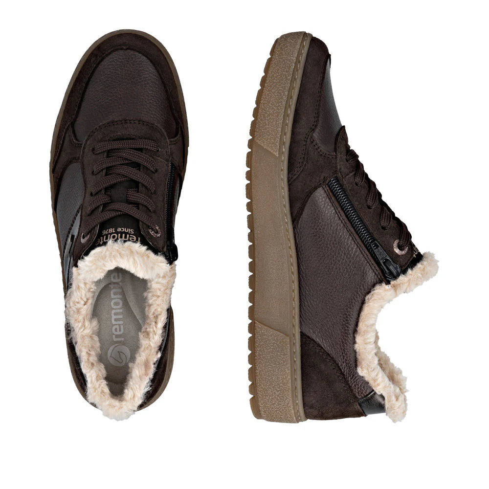 Ladies, pay attention! With these remonte low-top sneakers made of smooth leather are a must-have in any shoe cupboard this season. The clever combination of lacing and zipper provides optimal support and makes the shoe easy to put on and take off. The fluffy shaft edge effectively freshens up the design. The padded and removable insole meets a cushioning and grippy sole that superbly balances even hard ground. Thanks to the comfort width, there is enough space in the forefoot area. The shoe also hits the bull's eye when it comes to comfort thanks to the water-repellent remonteTEX membrane and the fluffy warm lining. Grab it, girls!