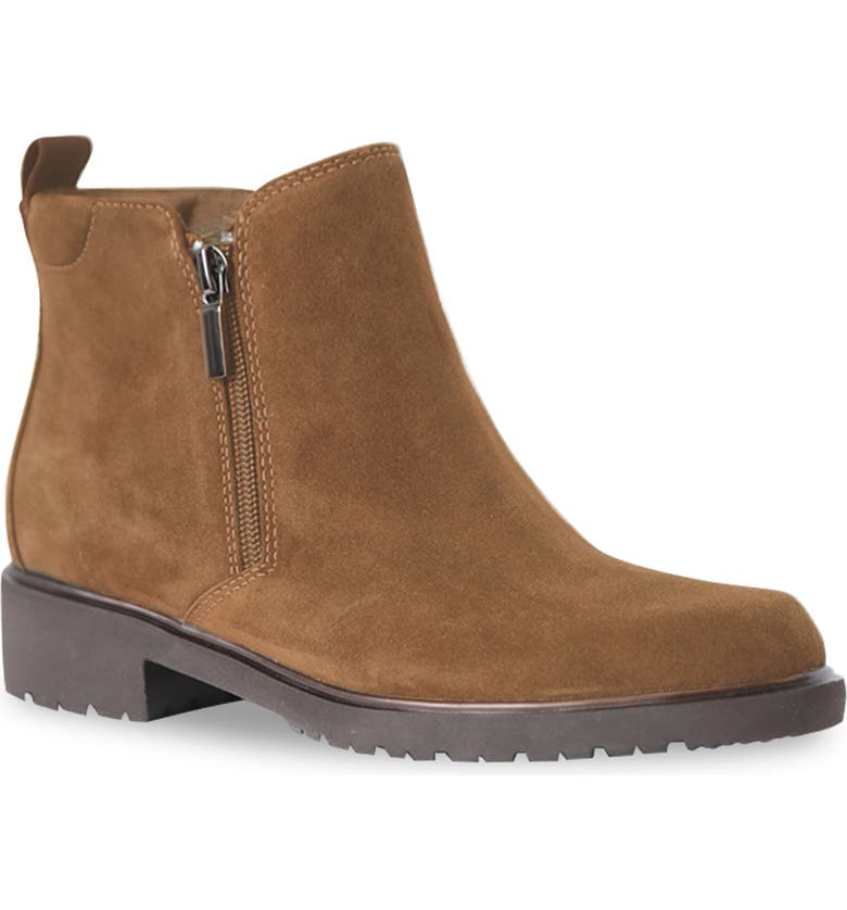 A breathable sock liner and built-in arch support add everyday comfort to a streamlined bootie complete with dual side zippers.